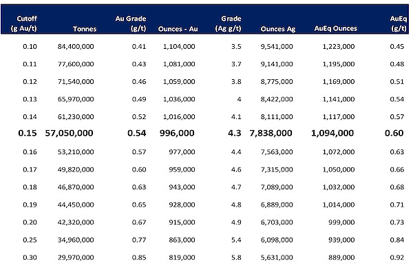 The resources in the table below reflect the estimate of Inferred gold equivalent resources at Eastside at a base case cut-off grade of 0.15 g/t gold as well as other cut-off grade levels which approximates anticipated economic cutoffs based on preliminary metallurgical test work and operations cost estimates for an envisioned open-pit with combined heap-leach and milling scenario. To determine the "reasonable prospects for eventual economic extraction" MDA chose to report the resource considering per tonne mining costs of US$1.35 and G&A costs of US$0.50 respectively. Heap-leach and milling costs used were US$4.60 and US$10.40, respectively. The prices of gold and silver were US$1,550 and US$19.67 per ounce, respectively, with gold equivalent ounces using a silver/gold ratio of 80:1. MDA ran a series of optimized pits using variable gold and silver prices, mining costs, processing costs and processing scenarios.
