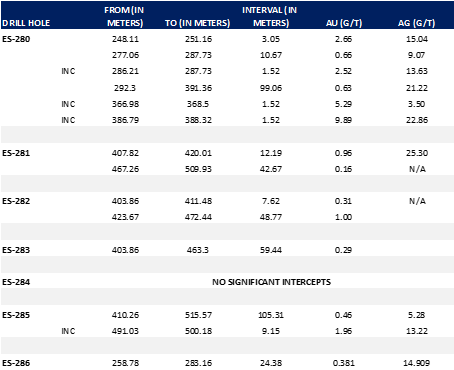 - 2 g/t Au over 9m at Hole ES-285 within a broader intercept of 0.46 g/t over 105m